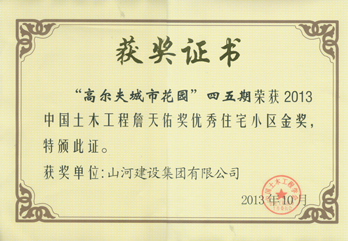 近日,由中国土木工程学会住宅工程指导工作委员会组织的2013年度“中国土木工程詹天佑优秀住宅小区”颁奖仪式在北京举行,由云博体育(中国)官方网站集团承建的 “武汉高尔夫城市花园四、五期”荣获“中国土木工程詹天佑奖优秀住宅小区金奖”。