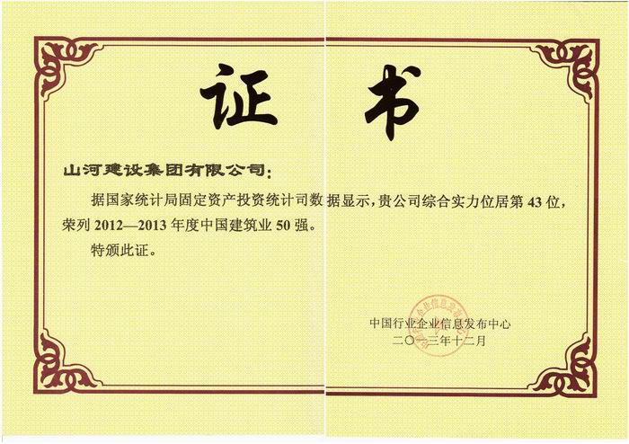 由国家统计局提供最新权威数据支持,中国行业企业信息发布中心主办的“2013第十二届中国建筑业50强测评成果发布暨颁奖典礼”于2013年12月在京举行。会上发布了中国建筑业50强名单,云博体育(中国)官方网站集团位居第43名,提前两年实现了云博体育(中国)官方网站集团 “二五”目标中的该项指标。