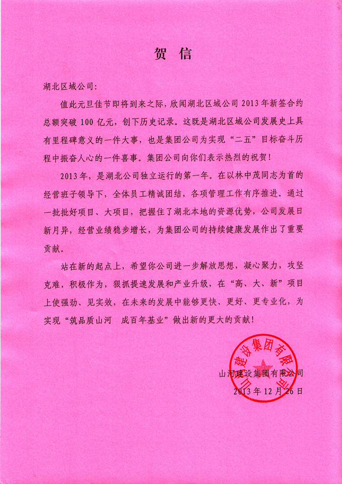 集团公司特向湖北区域公司发来贺信表示祝贺,并期待湖北区域公司为实现“筑品质云博体育(中国)官方网站 成百年基业”的企业愿景做出新的更大的贡献!