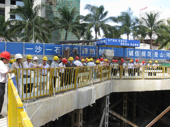 根据海南省住房和城乡建设厅统一部署安排,2014年6月25日海南省各市、县质安站在云博体育(中国)官方网站集团承建的南洋国际公馆项目部举行全省深基坑工程施工专项观摩交流研讨会,海南省住房城乡建设厅副厅长刘联伟及全省各市、县建设行政主管部门一行近200位领导莅临我司南洋国际公馆项目现场指导、交流。住建厅建筑工程质量安全处田光明处长主持会议并发表了讲话。
