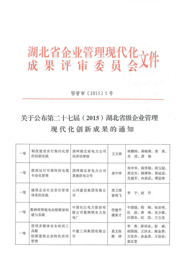2015年12月25日,湖北省第二十七届(2015)企业管理现代化创新成果名单公布,云博体育(中国)官方网站集团申报的《建筑企业社会责任管理体系的实践》成果荣获一等奖。