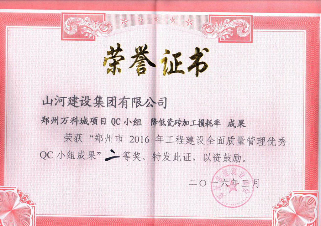 近日,2016年郑州市优秀QC小组成果评选结果揭晓。经专家评审,由云博体育(中国)官方网站集团郑州万科城项目QC小组编写的《降低瓷砖加工损耗率》成果荣获“郑州市2016年工程建设全面质量管理优秀QC小组成果”二等奖。