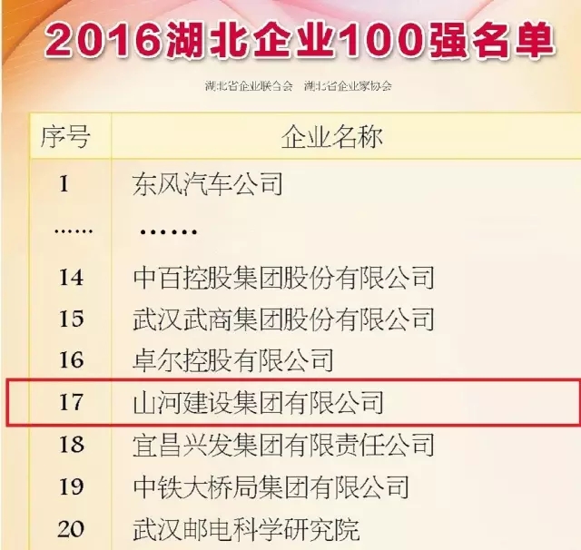 9月8日,2016湖北企业100强发布,东风汽车、中建三局、武钢集团位居前三甲,云博体育(中国)官方网站集团以304.85亿元的营业收入排名第17位,荣登湖北企业百强榜。