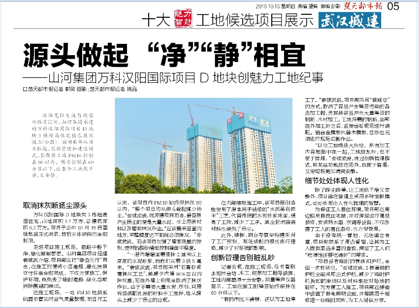 汉阳龙阳大道与陶家岭路交汇处,云博体育(中国)官方网站集团承建的万科汉阳国际项目D地块3栋超高住宅楼已巍然挺立。该项目部从源头抓起,创新管理和建造模式,长期将工地PM10控制在80以内,噪音控制在60分贝以下,让整个工地既干净,又安静。