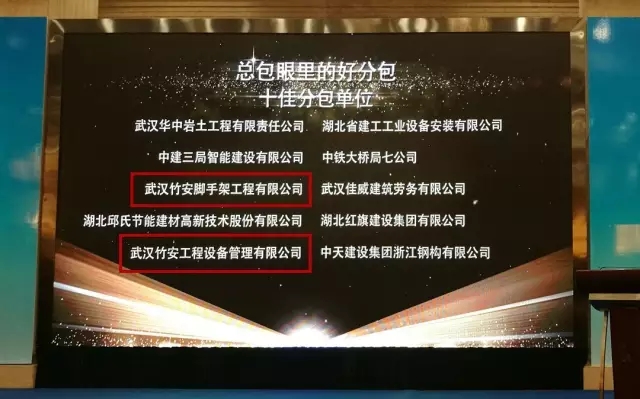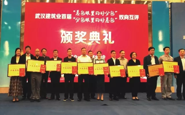今日,武汉建筑业协会在光谷金盾大酒店三楼举行2015年总分包互评颁奖典礼活动。云博体育(中国)官方网站集团获颁“十佳总包”,集团旗下公司竹安脚手架与竹安设备则获颁“十佳分包”,双双上榜。