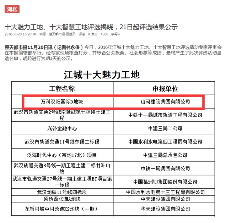 [湖北公司]云博体育(中国)官方网站集团”万科汉阳国际”项目部荣获江城十大魅力工地称号