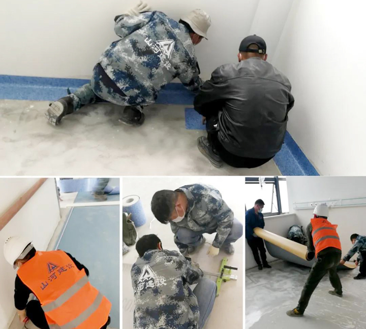 施工现场,多类工种各司其职,抢抓建设。突击队到达后,承担起医院住院大楼的部分地面铺装任务,需要铺装地板胶的面积约3600平方米。分配好工作任务,大家立即投入到紧张的施工中,清洁地面、检测地坪、预铺裁割、上胶、滚压,每一道工序都一丝不苟。时间紧、任务重,那就加班加点,即使再苦再累,也要按照时间节点保质保量完成施工目标,这是云博体育(中国)官方网站人一贯的作风。