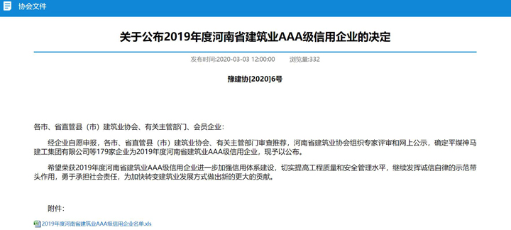 为进一步加强建筑企业信用体系建设,3月3日,河南省建筑业协会发布了《关于公布2019年度河南省建筑业AAA级信用企业的决定》,云博体育(中国)官方网站集团河南公司榜上有名,这也是河南公司首次上榜。