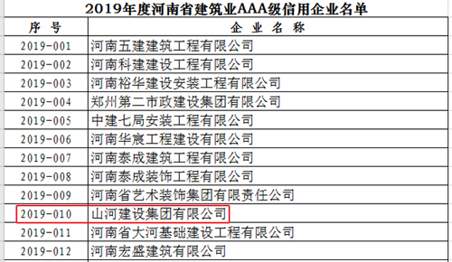 [河南公司]云博体育(中国)官方网站集团河南公司上榜河南省2019年度建筑业AAA级信用企业