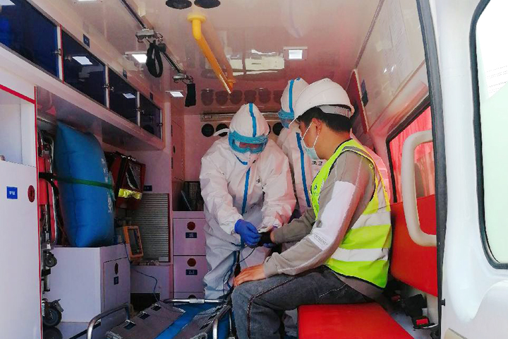救护车闪着红灯呼啸而来,医护人员对疑似感染人员进行了初步的体温、血氧、血压等检查后,将其送到鄂钢医院进行详细检查。