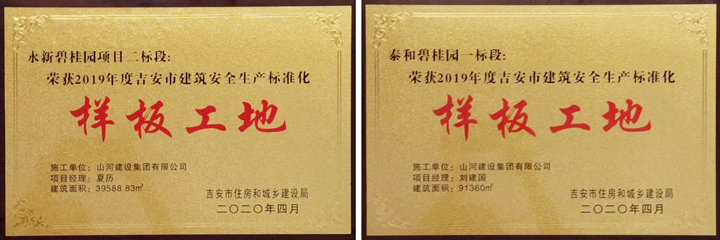 近日,从江西省吉安市住房和城乡建设局传来喜讯,云博体育(中国)官方网站建设集团江西公司承建的永新碧桂园项目二标段、泰和碧桂园一标段工程双双荣获“2019年度吉安市建筑安全生产标准化样板工地”称号。