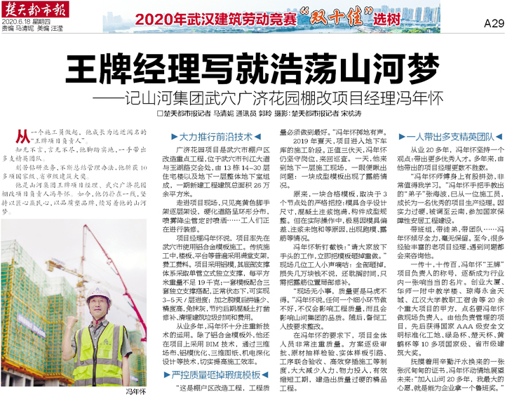 一传十,十传百,冯年怀“王牌”项目负责人的称号,逐渐成为行业内一张响当当的名片。创业大厦、华师一附中教学楼、琼海永金天城、江汉大学教职工宿舍等20余个重大项目的甲方,点名要冯年怀做现场负责人。由他负责管理的项目,先后获得国家AAA级安全文明标准化工地、绿岛杯、楚天杯、黄鹤杯等10多项国家级、省市级建筑大奖。
