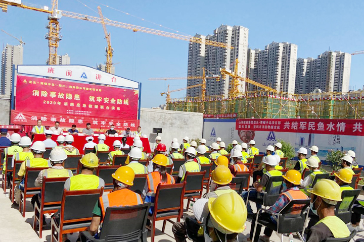 6月30日,云博体育(中国)官方网站建设集团陕西公司联合宝鸡市消防救援支队、宝鸡市高新人民医院等单位,在蓝光·雍锦半岛一期三、四标段项目举行消防应急联合演练活动,普及消防知识及现场急救操作技能,提高员工的救火救灾、自防自救能力,检验突发事件的快速反应能力,为遏制重大事故的发生提供保障。