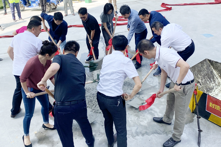 仪式上,各方代表共同挥动铁锹,完成最后一方混凝土浇筑,标志着该项目主体工程正式封顶,为下一阶段的施工打下良好基础。