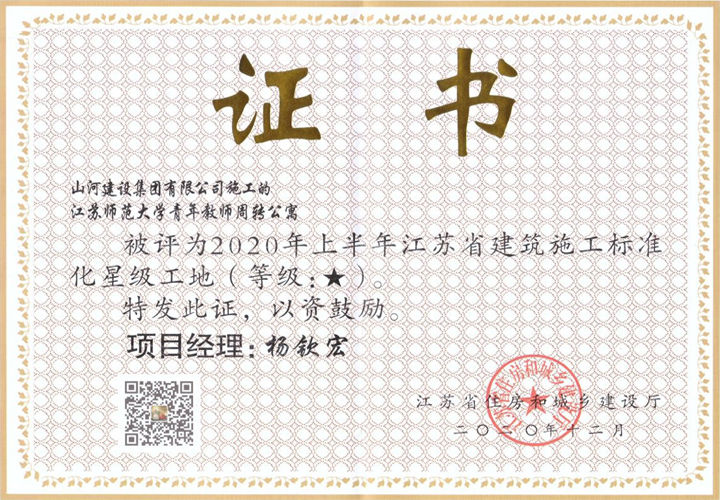 近日,从江苏省住房和城乡建设厅传来喜讯,云博体育(中国)官方网站建设集团江苏公司承建的江苏师范大学青年教师周转公寓工程被评为“2020年上半年江苏省建筑施工标准化星级工地”,再添一项省级荣誉。