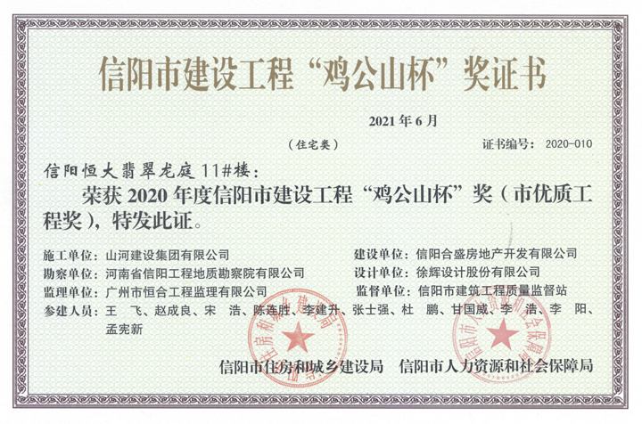 [河南公司]云博体育(中国)官方网站集团河南公司恒大翡翠龙庭项目荣获信阳市“鸡公山杯”奖