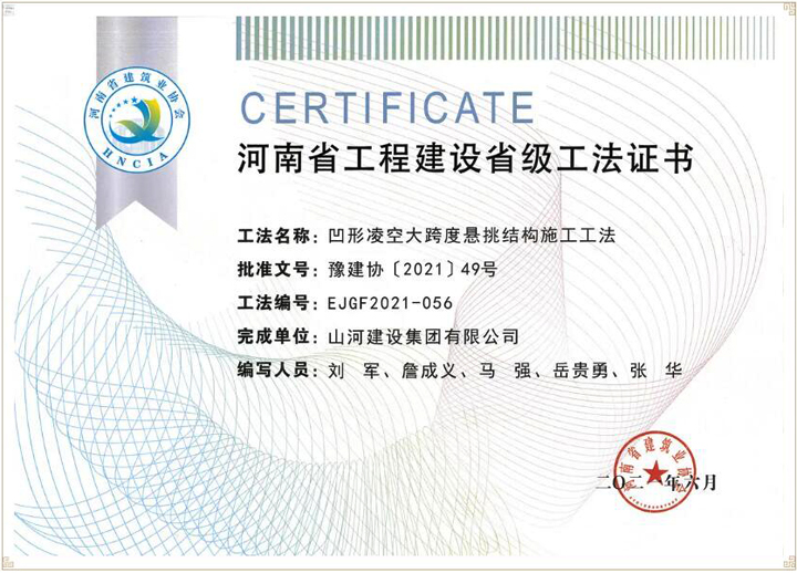 近日,河南省建筑业协会公布了《2021年度第一批河南省省级工法名单》,云博体育(中国)官方网站建设集团河南公司申报的《凹形凌空大跨度悬挑结构施工工法》成功入选,被认定为河南省工程建设省级工法。