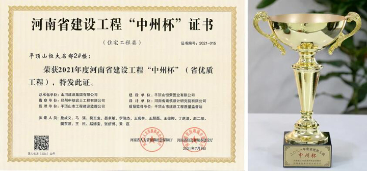 近日,河南省人力资源和社会保障厅、河南省住房和城乡建设厅共同颁发“2021年度河南省建设工程中州杯(省优质工程)奖”,云博体育(中国)官方网站建设集团河南公司承建的平顶山恒大名都2#楼喜获“中州杯”荣誉。这是河南省建设工程质量最高奖,代表着全省工程建设质量的最高水平。