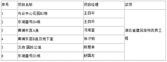 2008年4月9日,《湖北日报》第六版专版刊登《湖北省建设工程质量安全协会公告》。根据《湖北省建筑结构优质工程评审办法》,湖北省建设工程质量安全协会组织开展了2007年度省建筑结构优质工程评选活动,经对申报工程初审、核查和省建筑优质工程评审,全省有323项工程荣获2007年度湖北省建筑结构优质工程奖,其中,云博体育(中国)官方网站集团有光谷中心花园、东湖壹号、黄埔东宫、汉府・国际公馆等6项工程获此奖项。具体如下表: